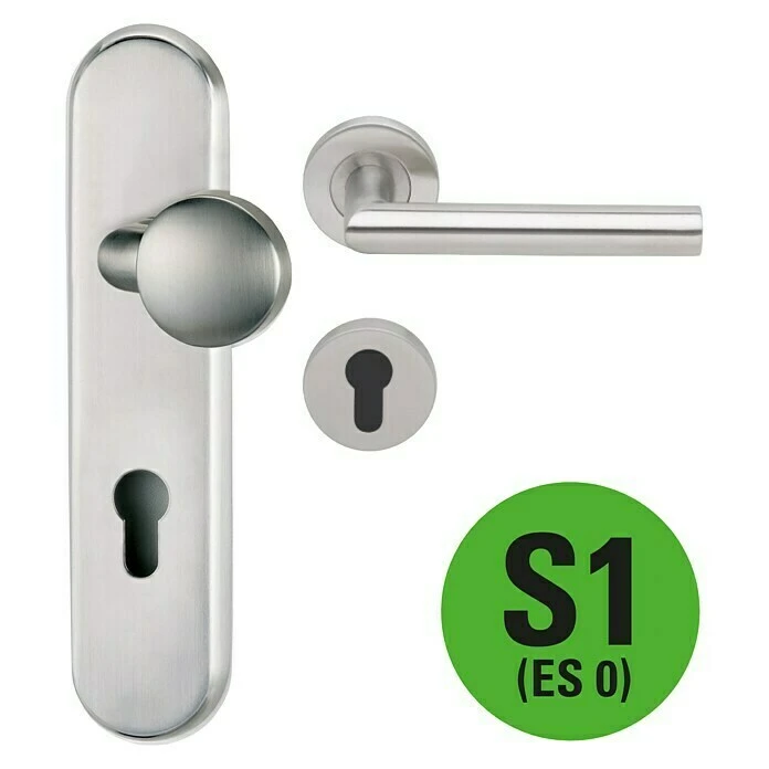 Der Schutzbeschlag Modern warrior von Diamond Doors eignet sich für den Einsatz auf Haustüren mit einer Türstärke von 35 – 45 mm. Er verfügt über einen R2 Knopf auf der Außenseite sowie eine Rosettengarnitur mit L-Förmigem Drücker auf der Innenseite. Er eignet sich sowohl für rechts als auch links angeschlagene Stumpf- und Falztüren. Der nach DIN 18257 ES0 geprüfte Sicherheitsbeschlag ist einbruchhemmend und durch eine Spezial gehärtete Stahlplatte gegen aufbohren, abschlagen und aufbiegen geschützt. Die Verschraubung ist unsichtbar unter dem aus Edelstahl bestehenden Schild verborgen und bietet zusätzlich einen hohen Abreisschutz.