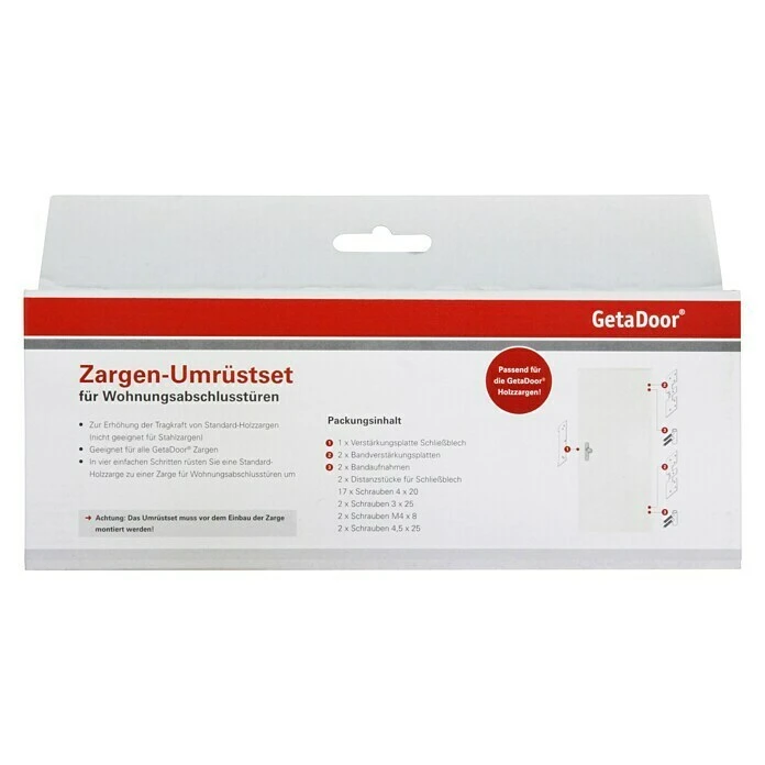 Das Zargen-Umrüstset von GetaDoor sorgt für eine Erhöhung der Tragkraft von Standard-Holzzargen. Das praktische Ergänzungspaket ist für alle GetaDoor Holzzargen geeignet. In vier einfachen Schritten lässt sich auf diese Weise eine Standard-Holzzarge zu einer Zarge für Wohnungsabschlusstüren umrüsten.